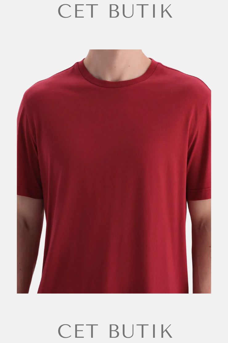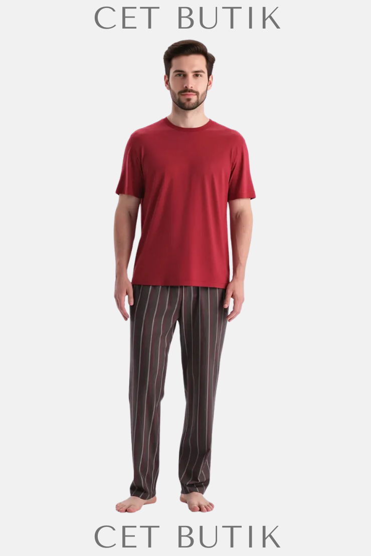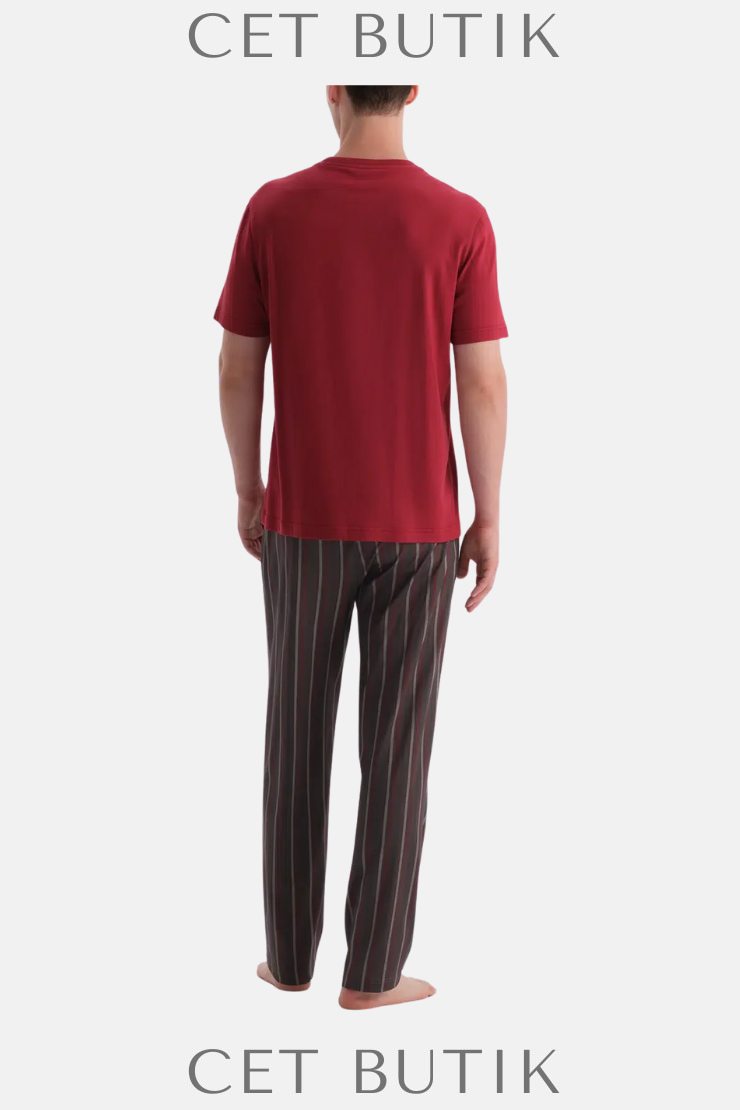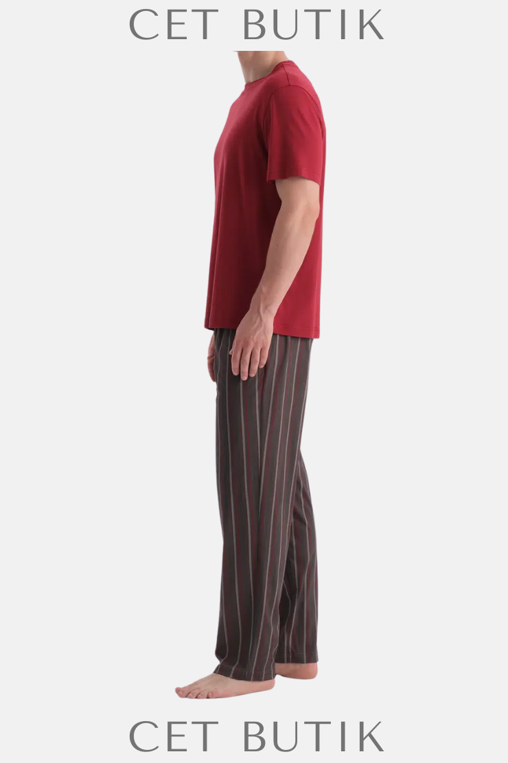 DAGİ 25WM18679ME — Bordo renkli kısa kollu takım, tişört üst ve çizgili pantolon alt tasarımıyla modern bir uyum sunar. Süprem kumaş yapısıyla hafif ve esnek, vücuda uyumlu yapısı ile konfor sağlar. Günlük ev kullanımından dış giyime geçişte şık ve rahat bir tercih.