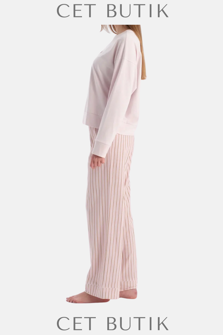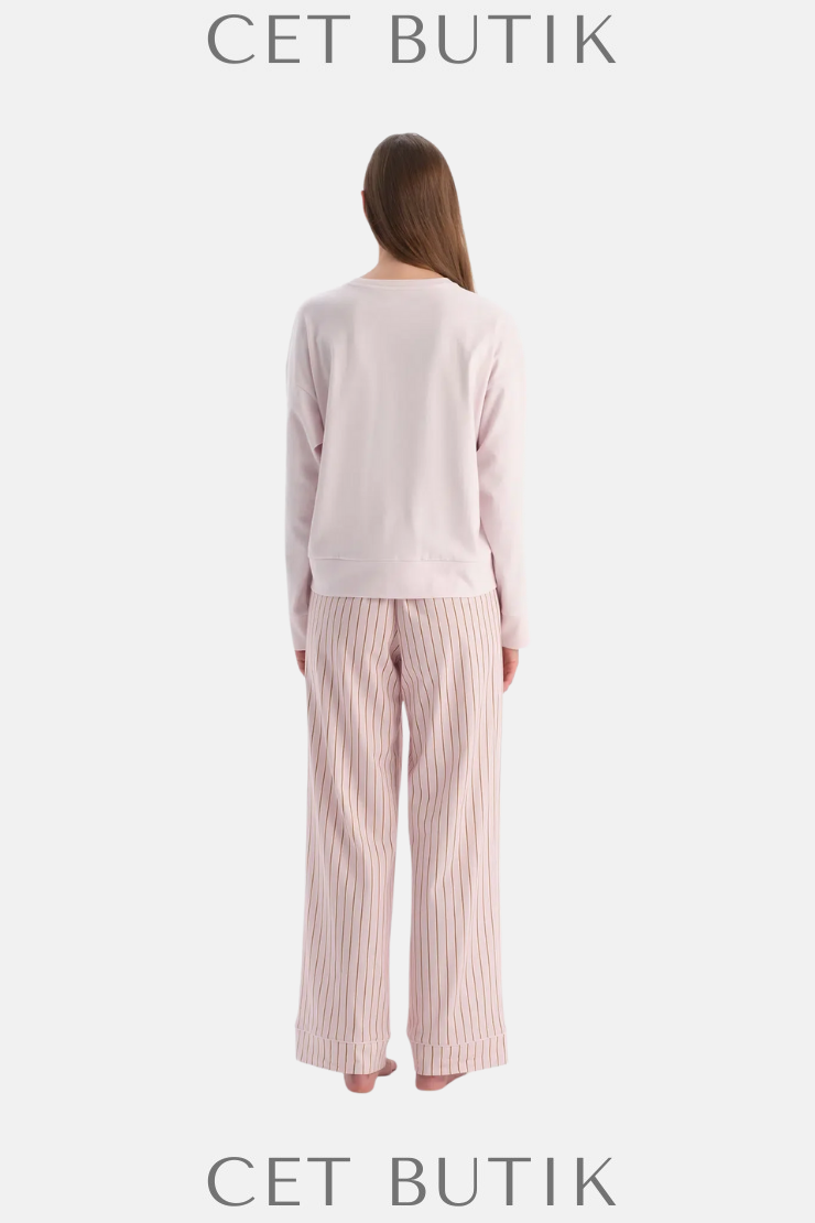 Üstte açık lila tonda titreşimli köpek baskısı dikkat çekerken, yumuşak suprem kumaş dokusu gün boyu konfor sunar. Altında uyumlu tonlarda pantolon ile takım bütünlüğü korunur. Bu takım, ev giyimi ve günlük kombinleriniz için ideal bir seçenek olabilir. Bu takım ile yumuşak tonlarla kombinler oluşturabilir, açık renk pantolon ya da terliklerle şık ve rahat görünümler elde edebilirsiniz.