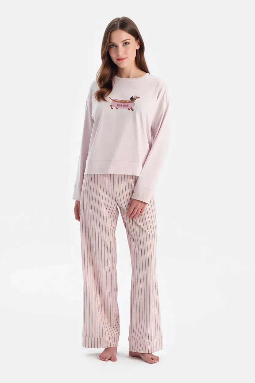 Dagi’nin zarif ve sevimli detaylarla tasarlanmış “Açık Lila Köpek Baskılı Tişört & Pantolon Takım”ı, hem evde hem günlük kullanımda şıklık ve rahatlığı bir araya getiriyor.