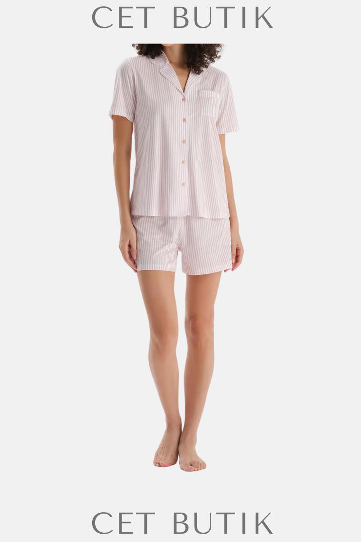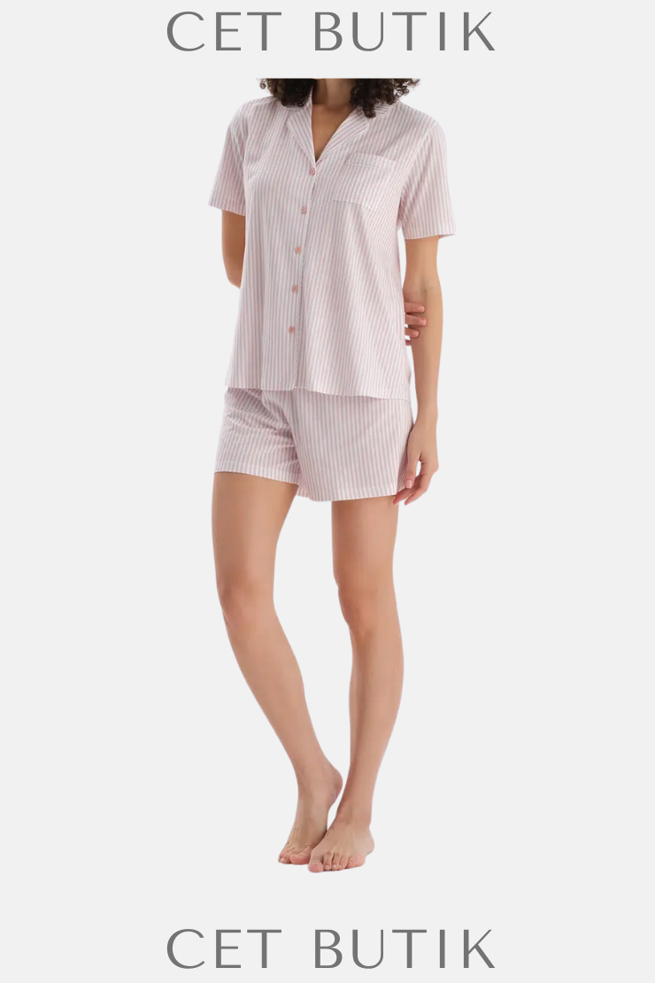 Dagi Açık Pembe Nakışlı Çizgili Penye Modal Gömlek & Şort Pijama Takımı