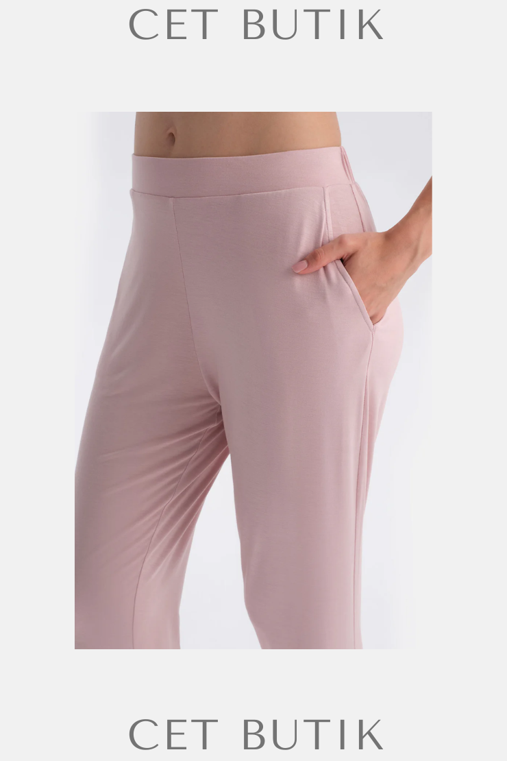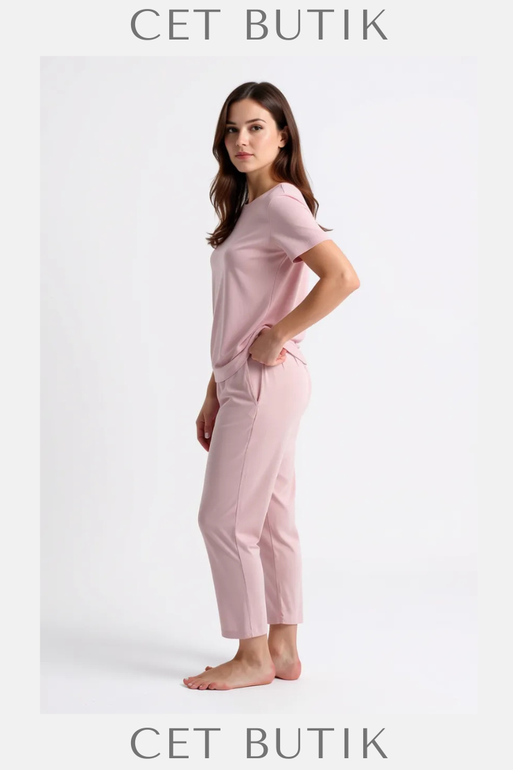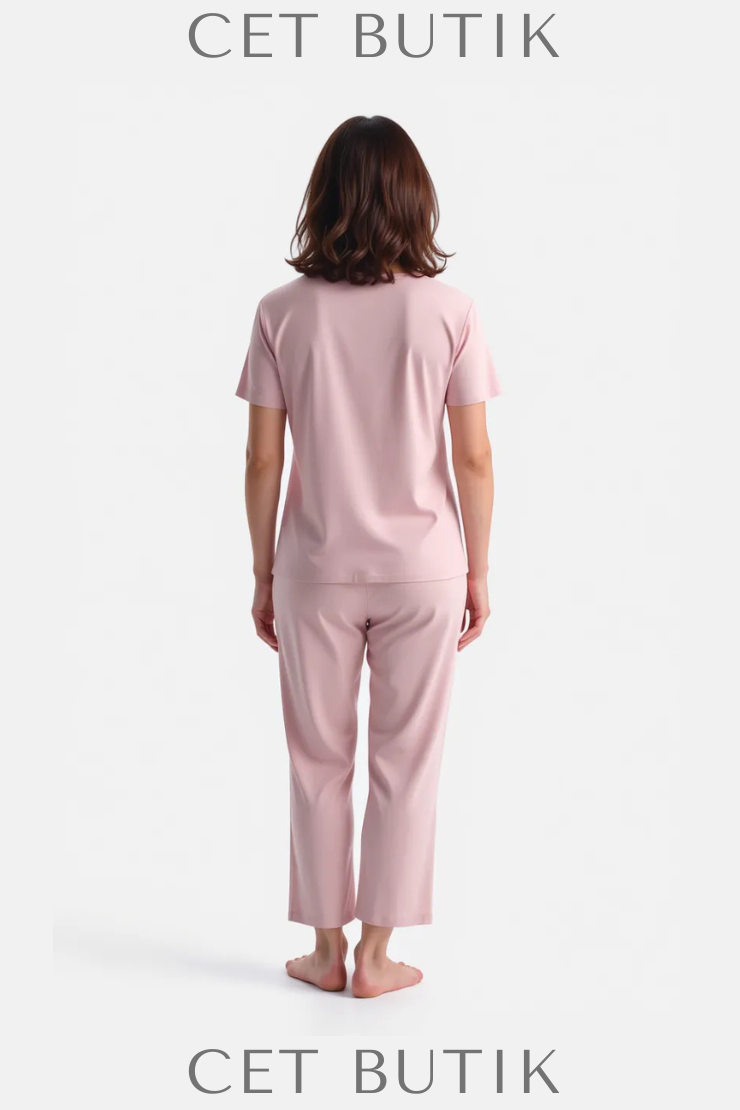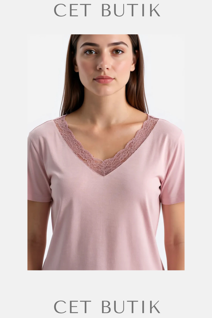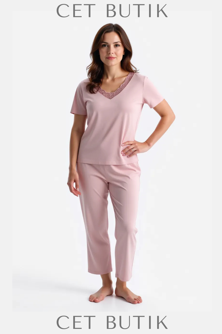 Dagi Açık Pembe V Yaka Dantel Detaylı Tişört & Pantolon Takımı – Zarif Konfor