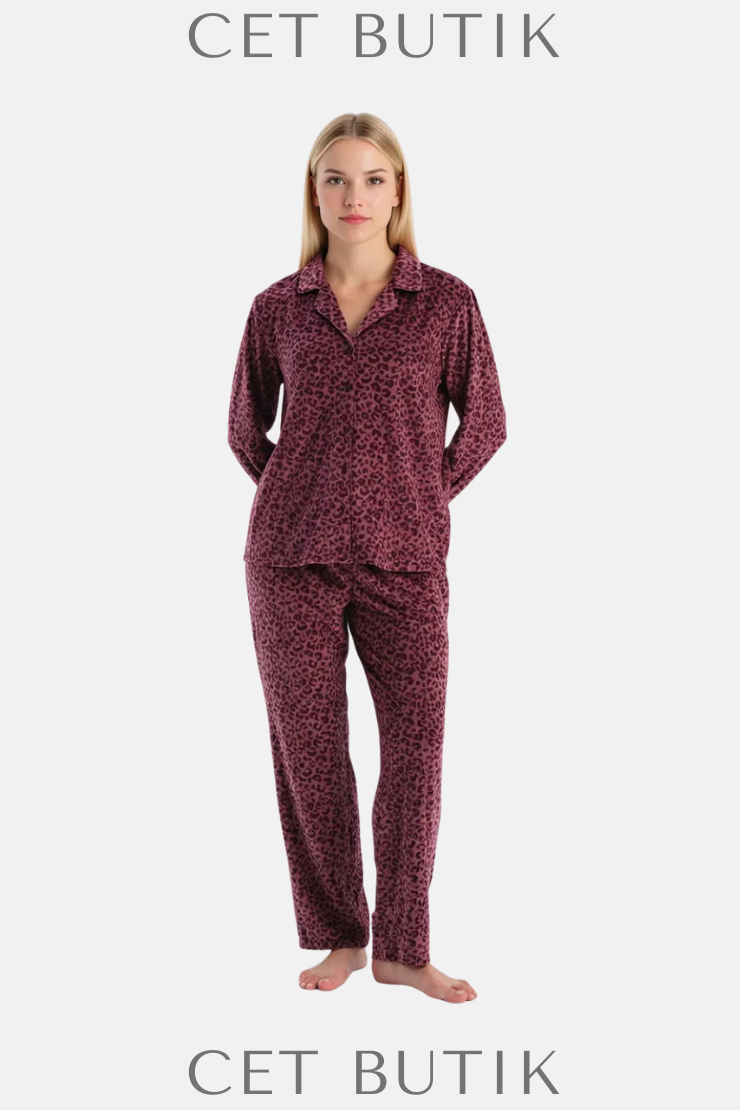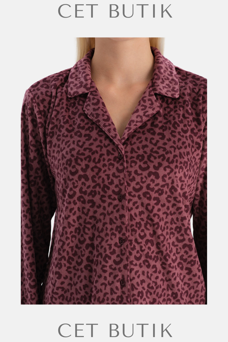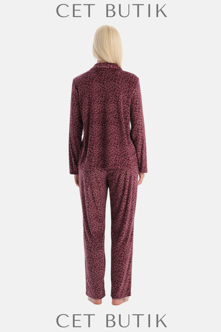 Dagi Bordo Leoparlı Kadife Gömlek & Pantolon Takım