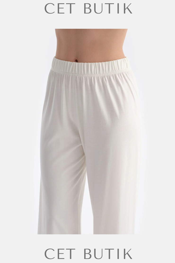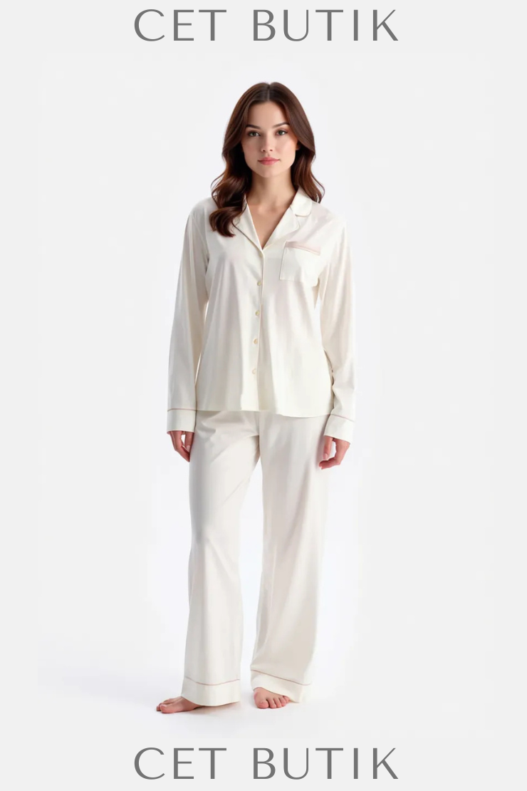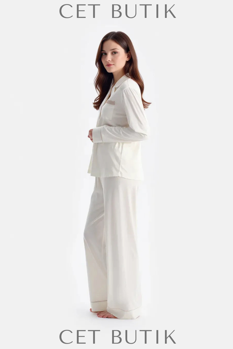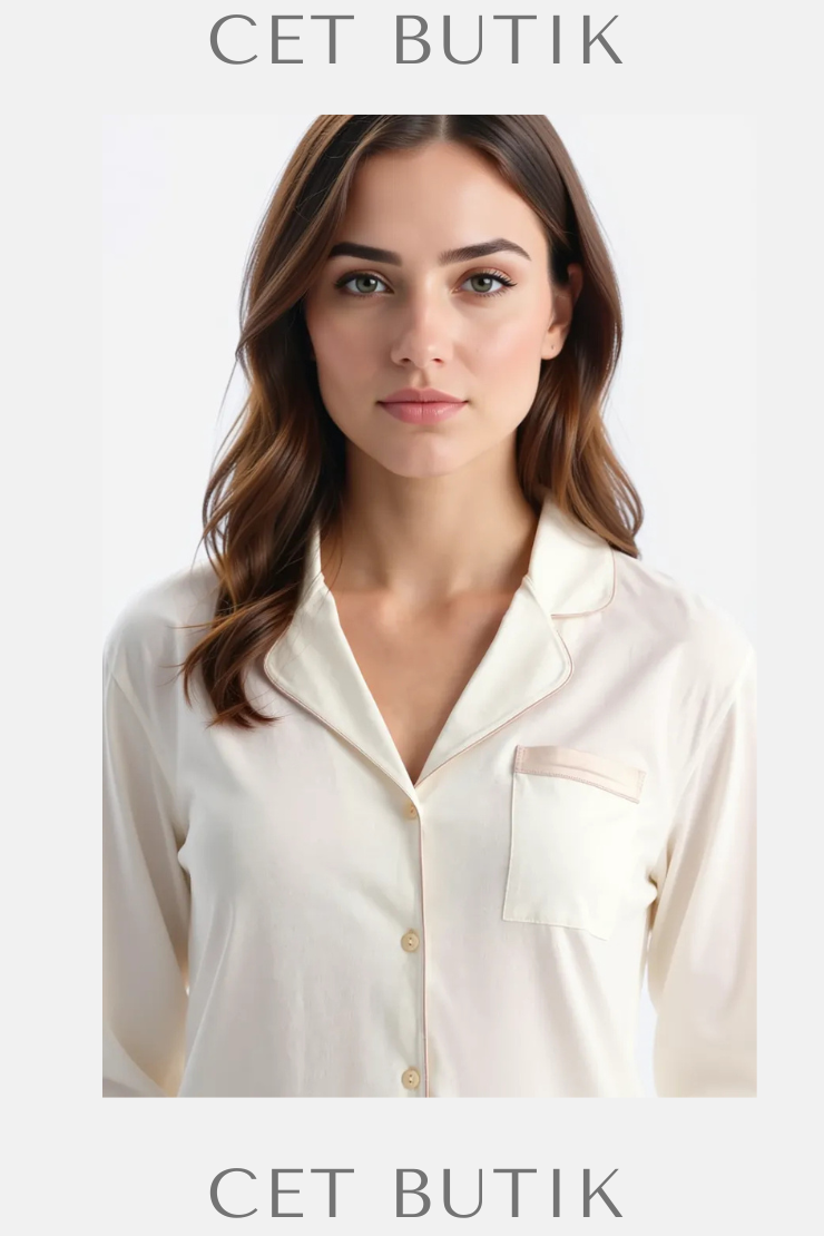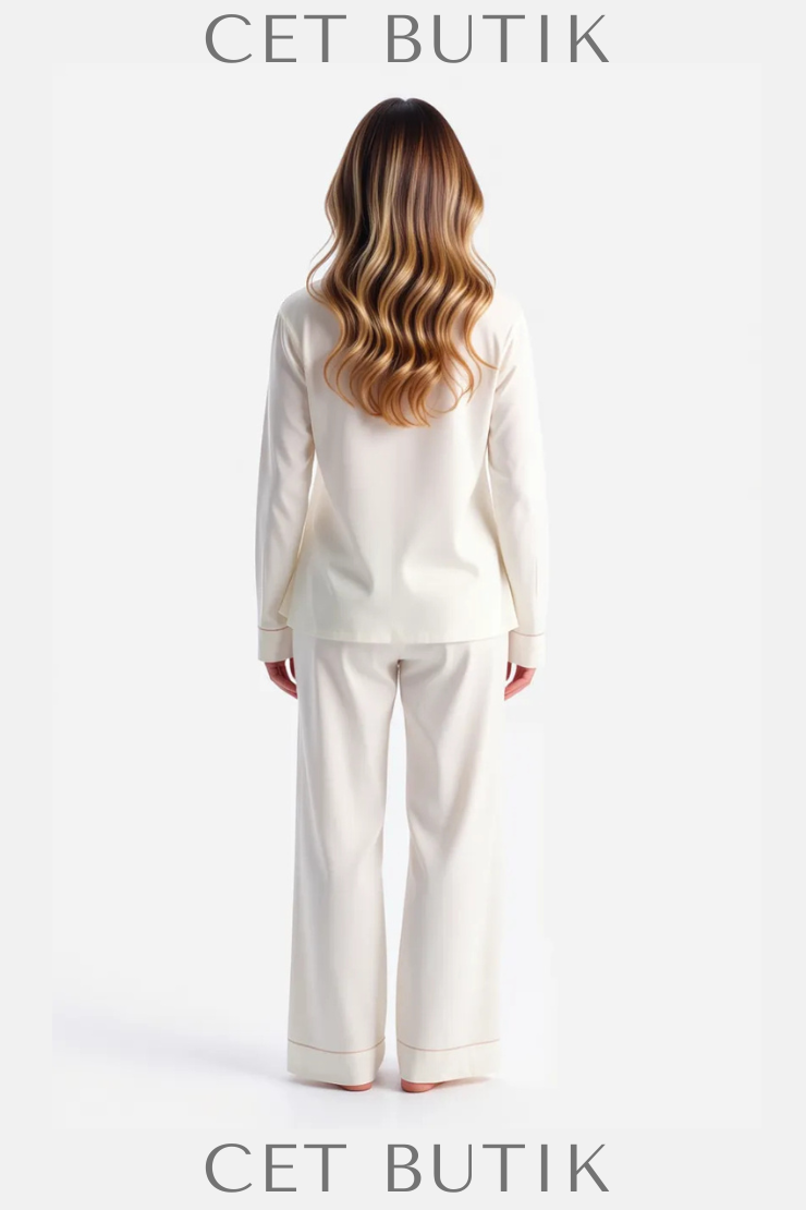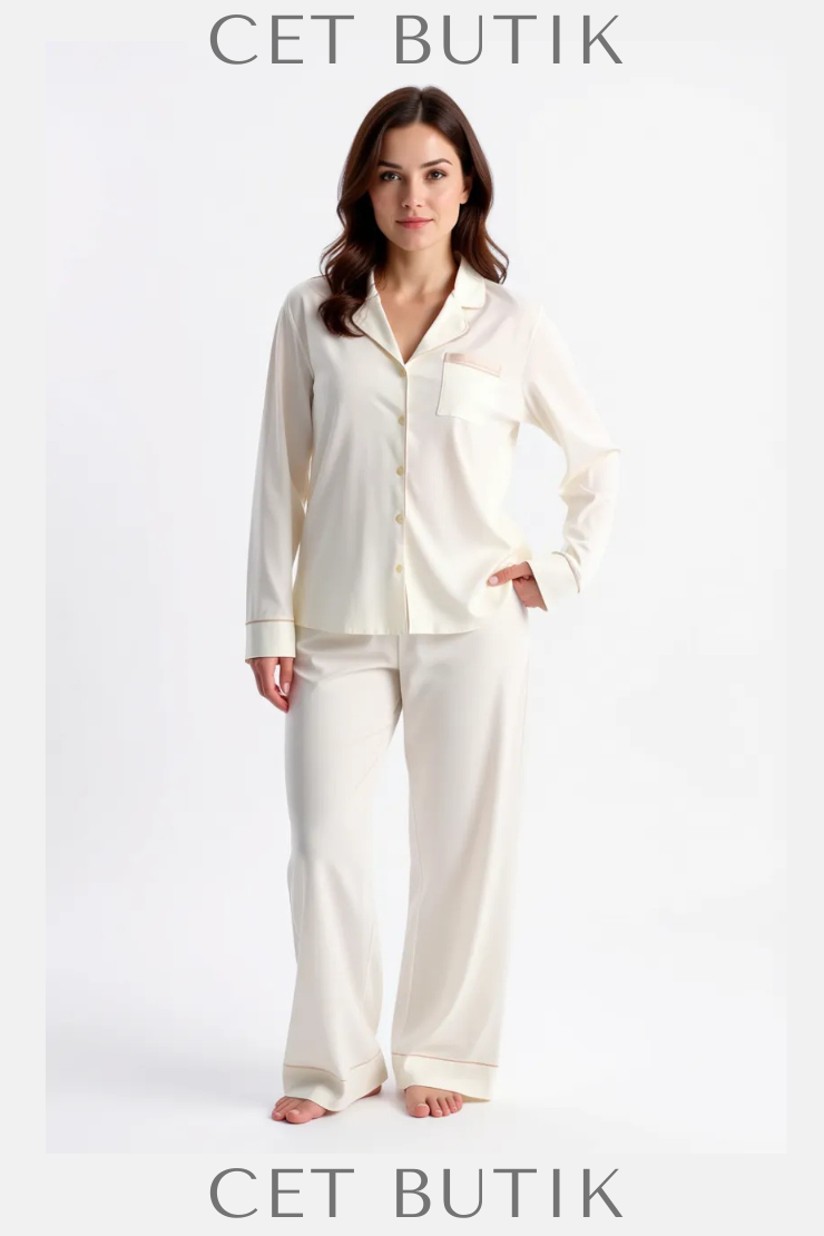 Dagi Ekru Saten Detaylı Gömlek & Pantolon Takımı – Zarif Süprem Konfor