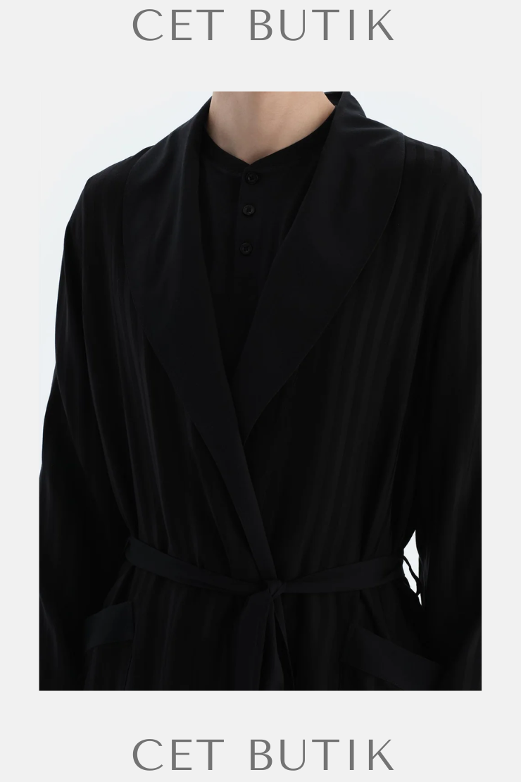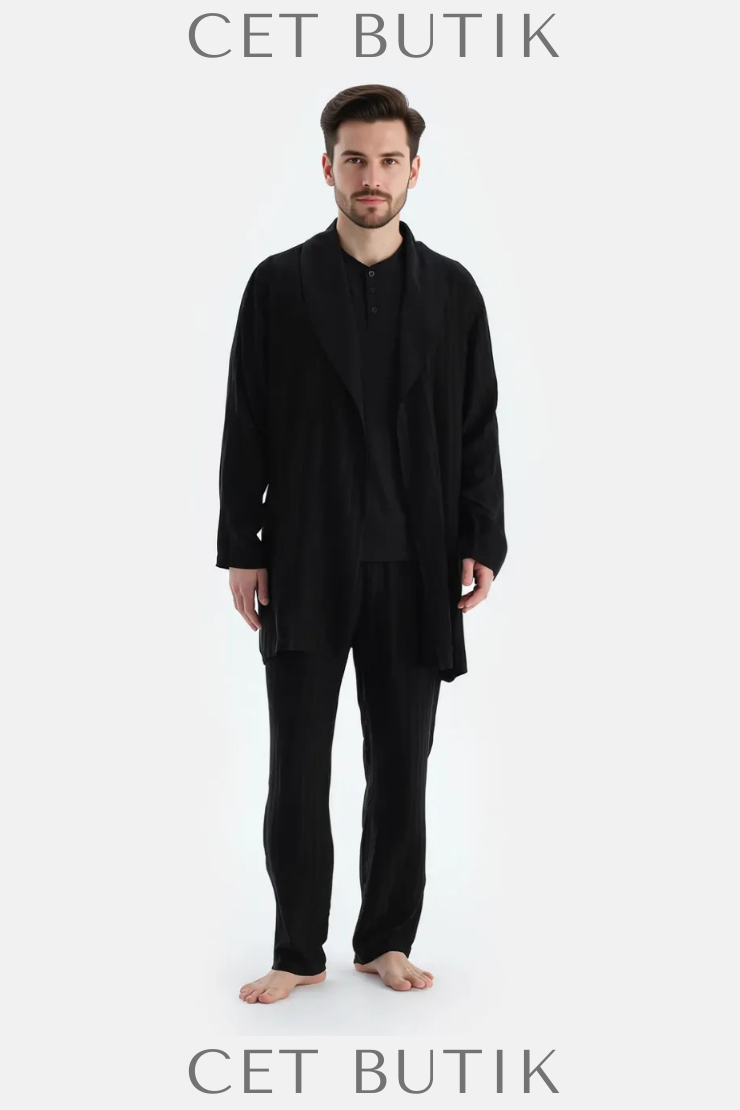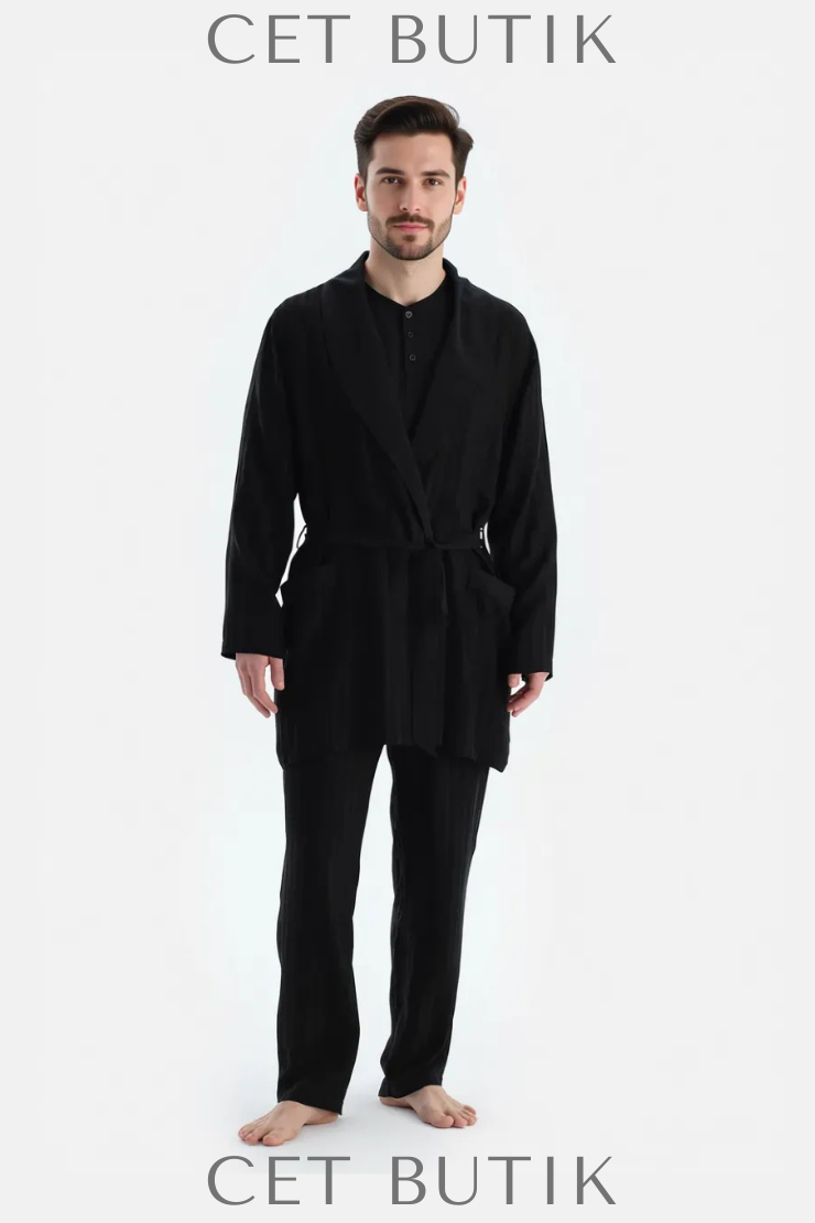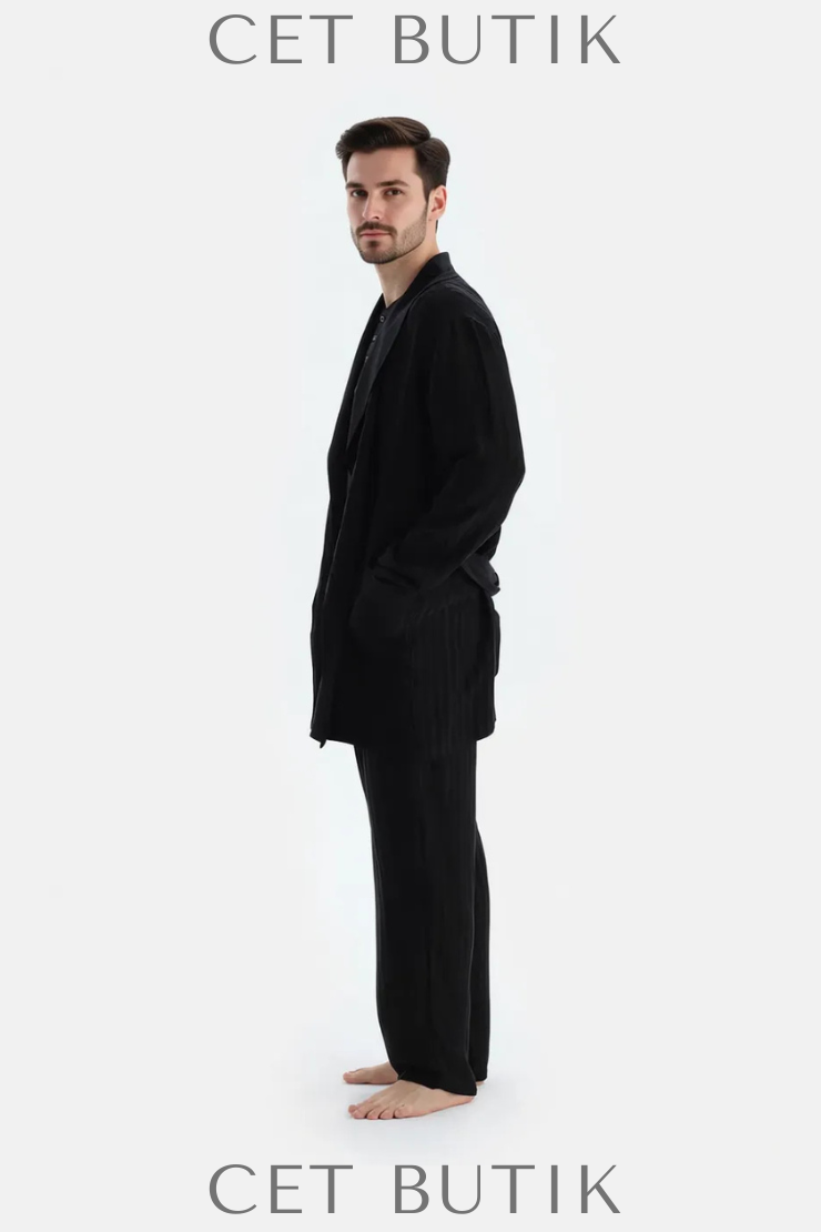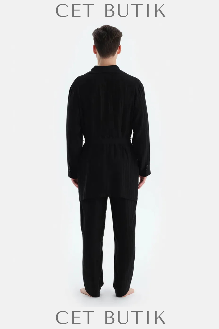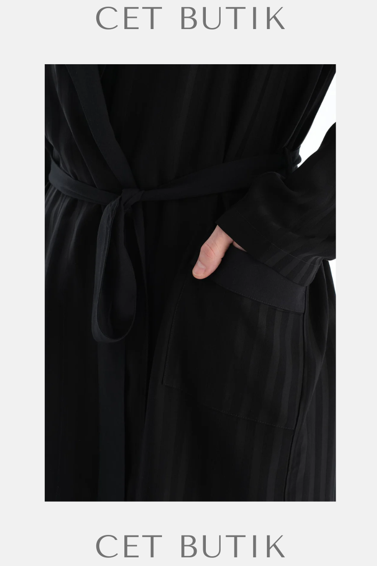 Dagi Siyah Çizgili Dokuma Groom Sabahlık – Uzun Kol, %100 Viskon Erkek Sabahlık