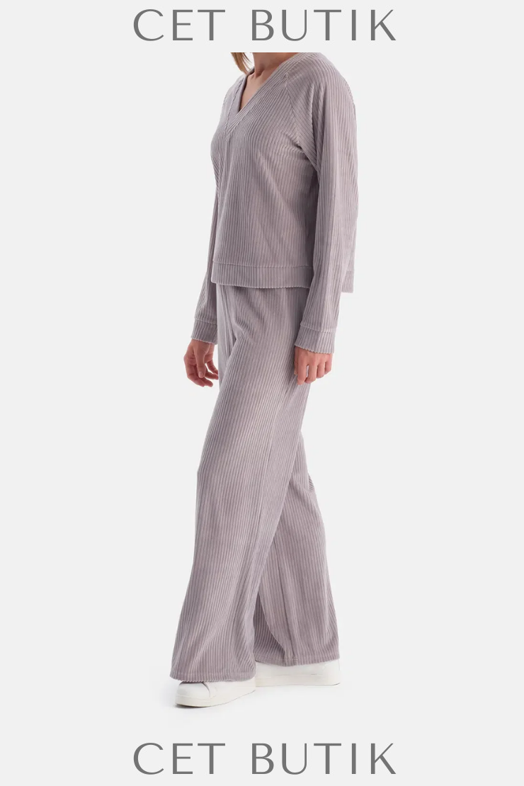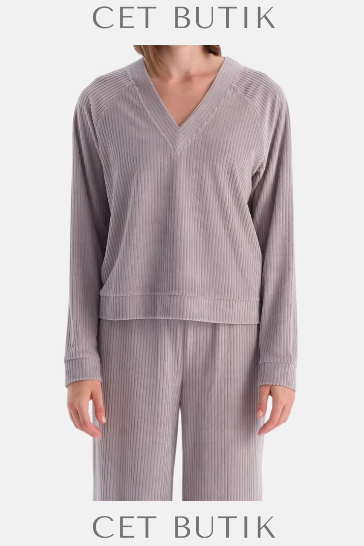 Dagi V Yaka Uzun Kollu Kadife Sweatshirt
