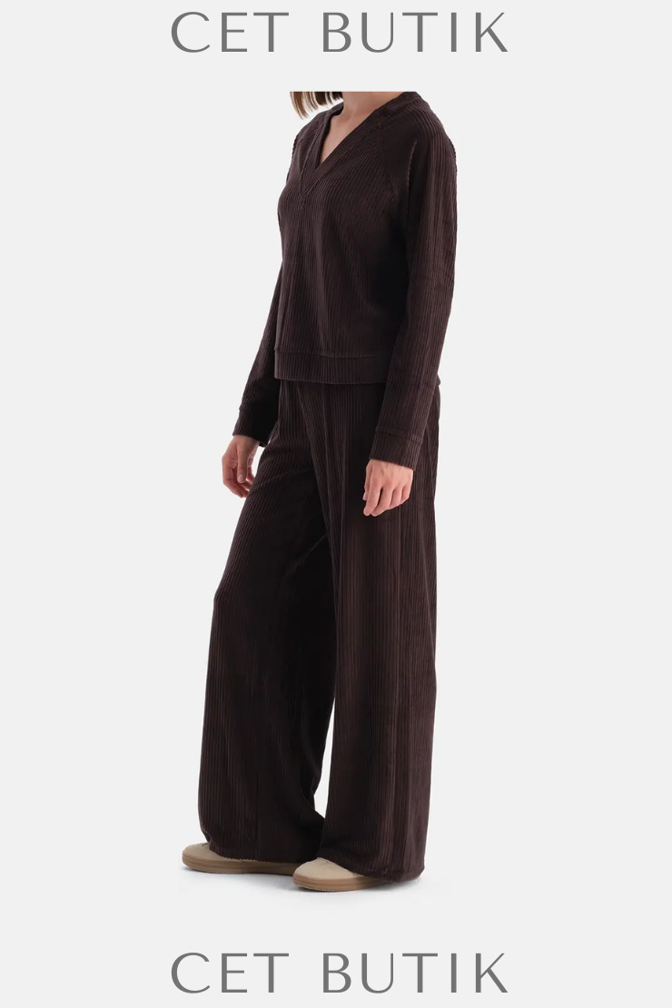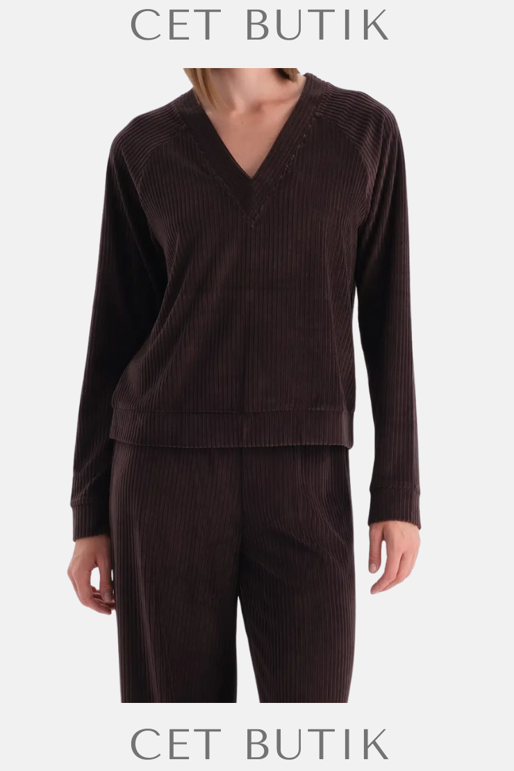 Kadifeye modern yorum getiren Dagi 25WW11331BB Koyu Kahve Açık Lila V Yaka Sweatshirt, sıcak tutan yapısıyla şık bir dış giyim alternatifi sunar.