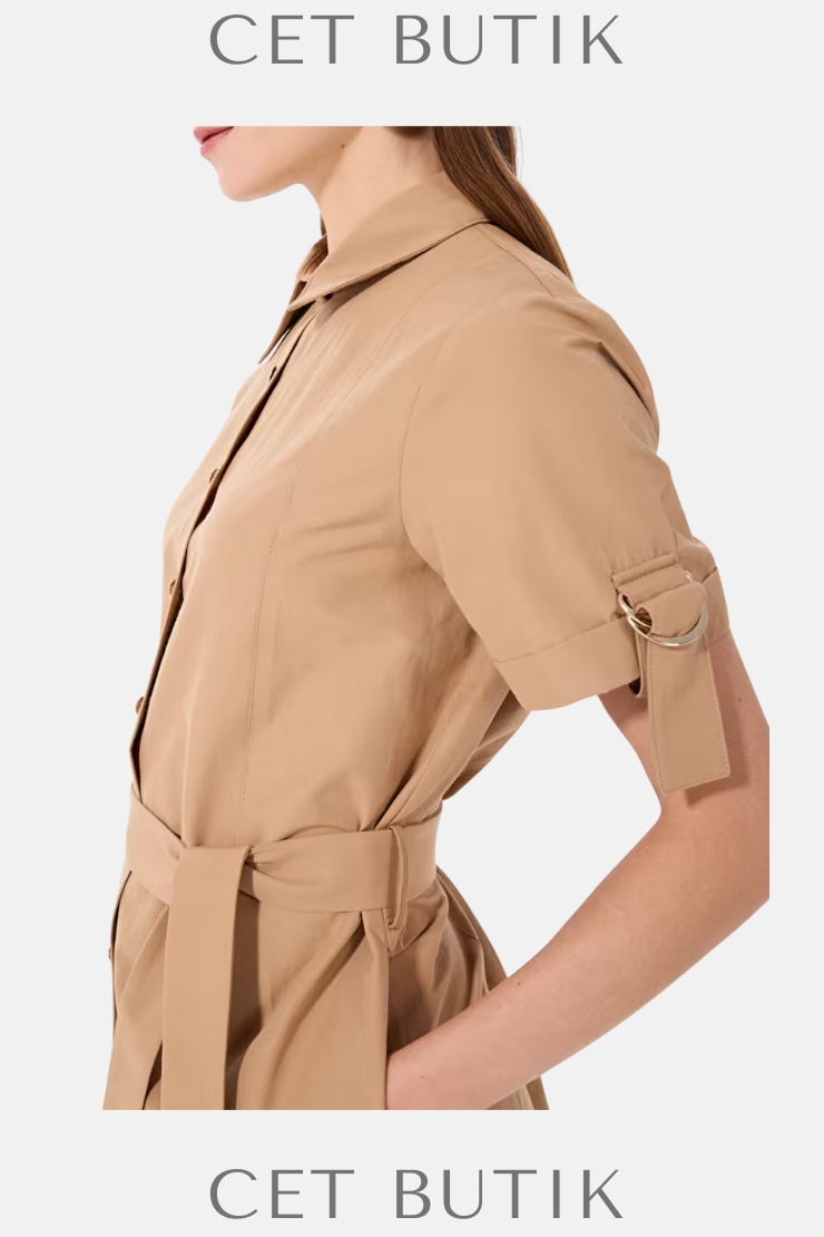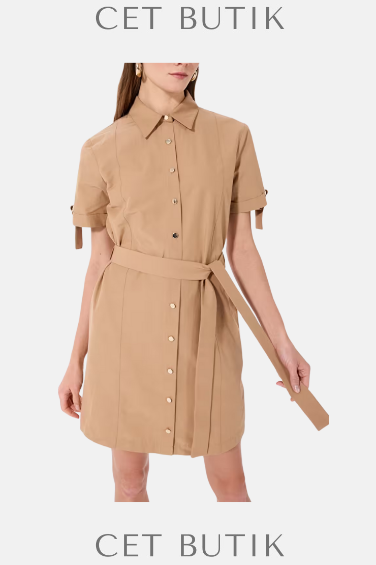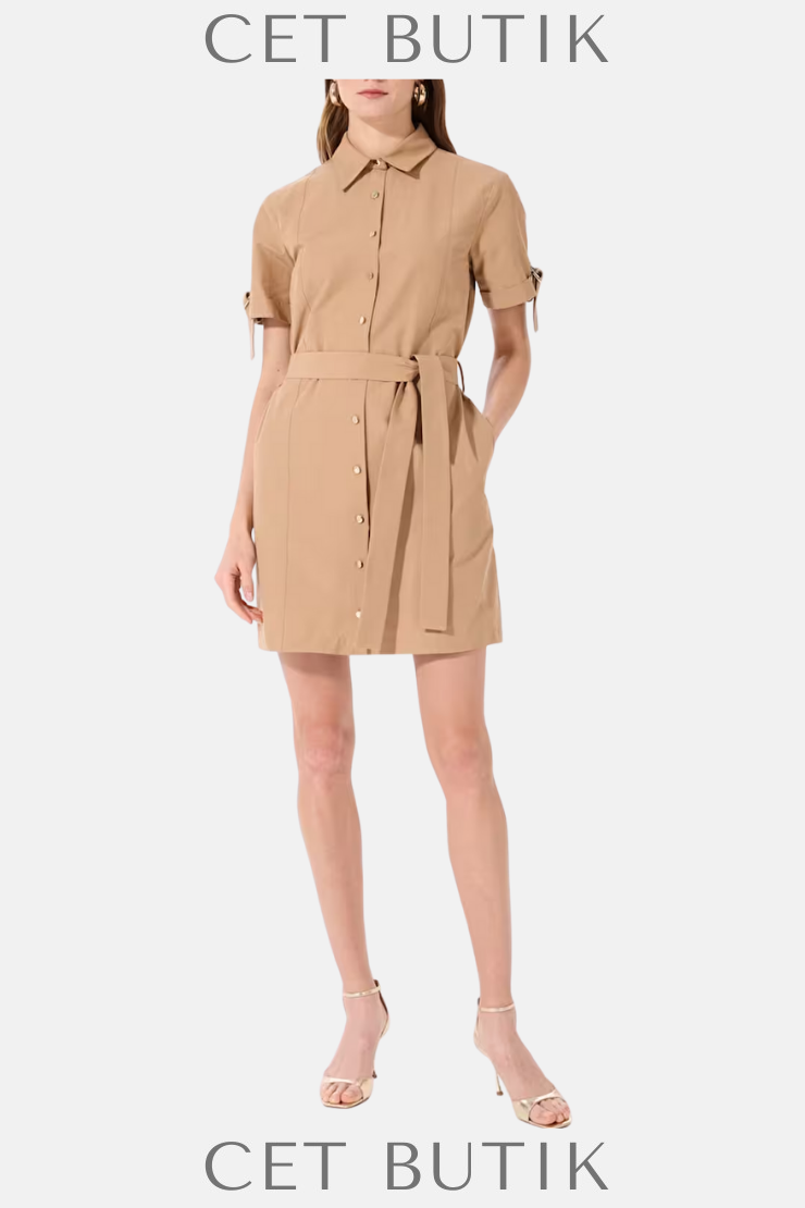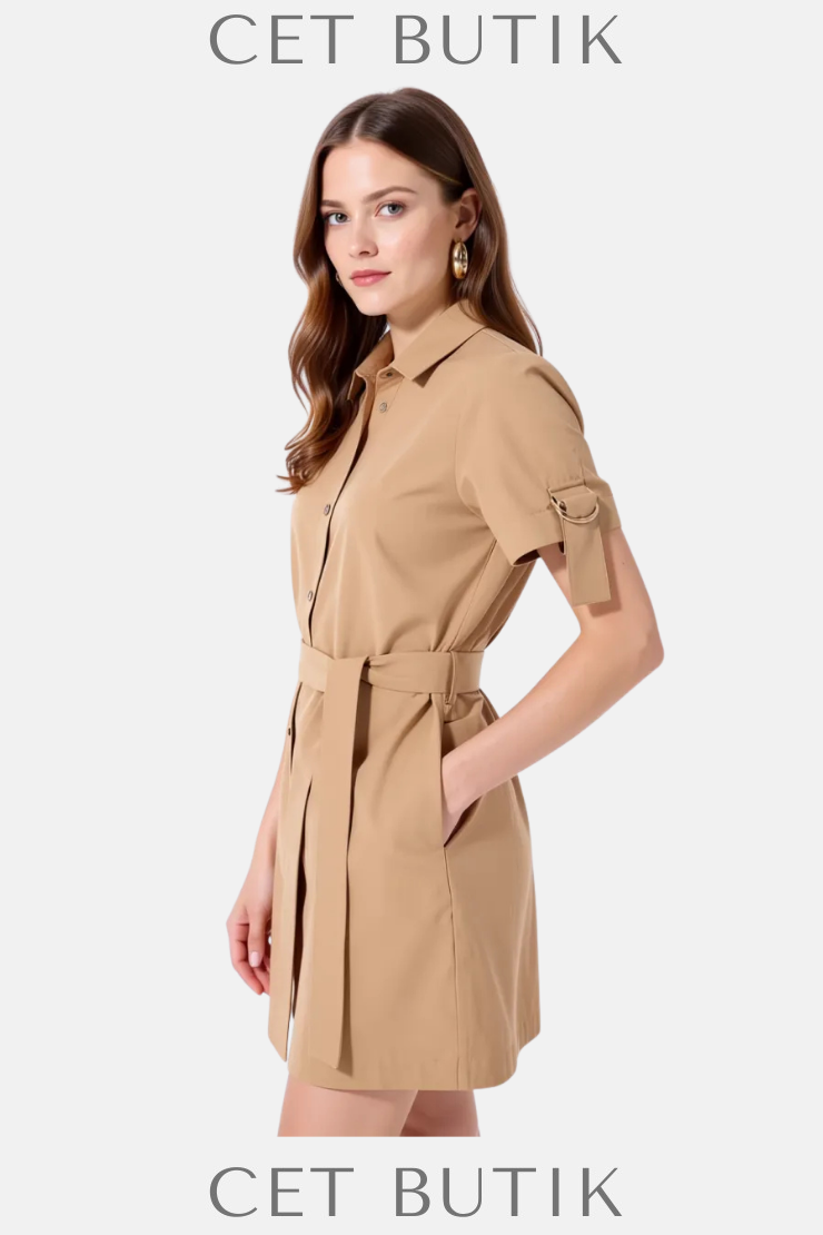 Fabrika Gömlek Yaka Düz Bej Kısa Kadın Elbise