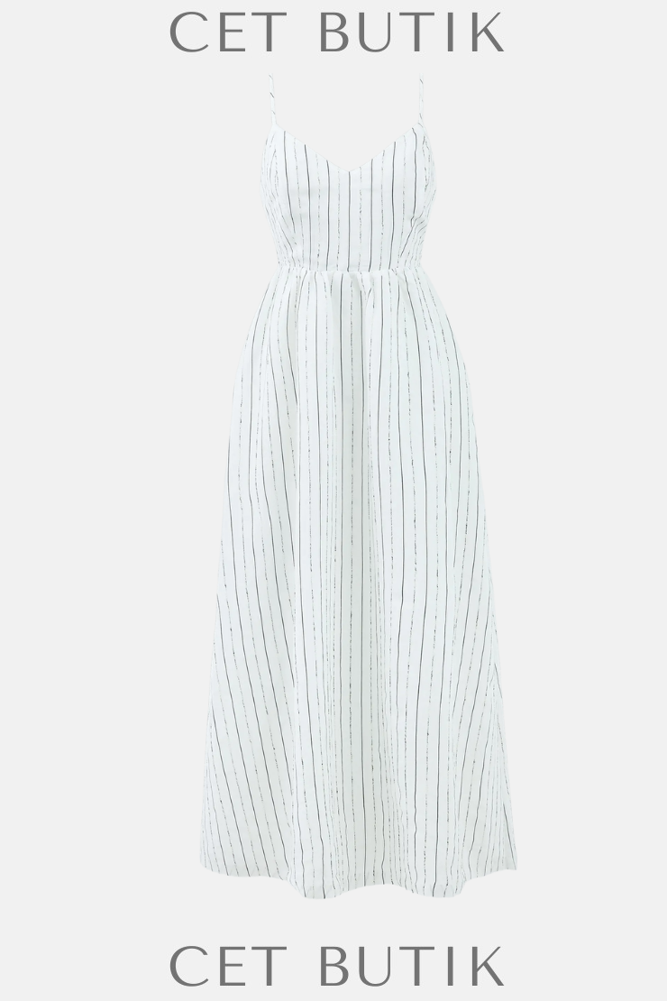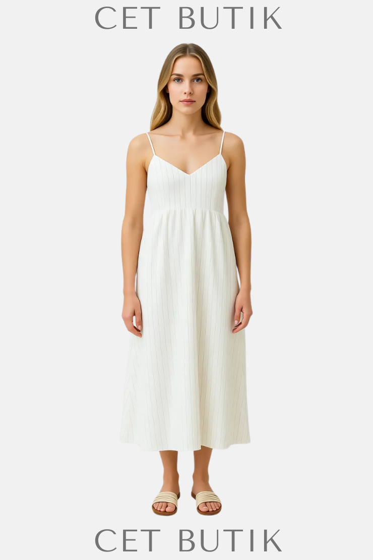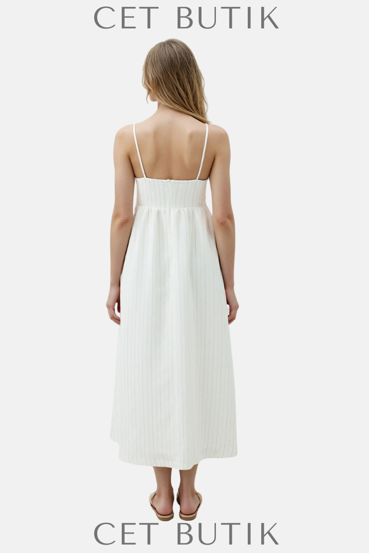 Jimmy Key Ekru Midi Dokuma Elbise – Açık Yaka Askılı
