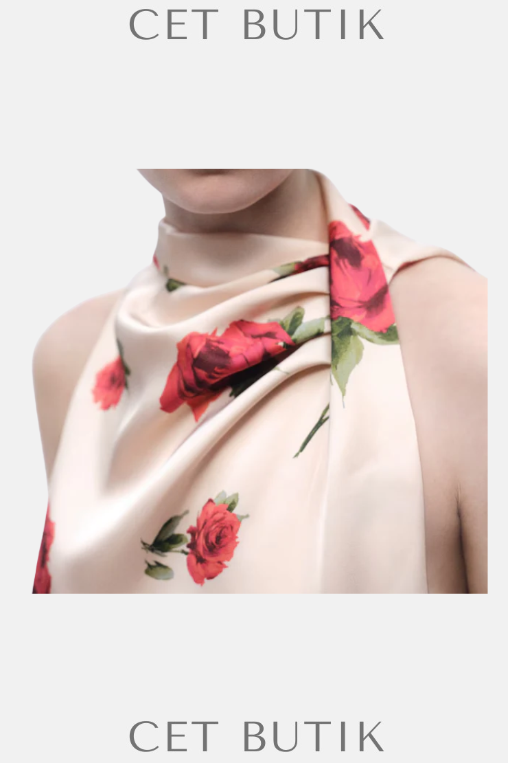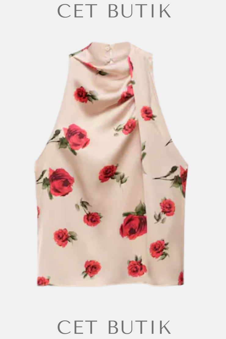 Parlak dokusuyla dikkat çeken bu Mango bluz, saten kumaşı ve floral baskılı deseniyle zarif bir stil sunar. Straight (düz) kesim modeli, halter yaka ve drapeli (draped) yakasıyla feminen bir görünüm yaratır. Kolsuz tasarımı ile yaz akşamlarından özel davetlere kadar geniş kullanım imkanı sağlar. Arka kısmındaki düğme kapama detayı ile kolay giyilip çıkarılır.
