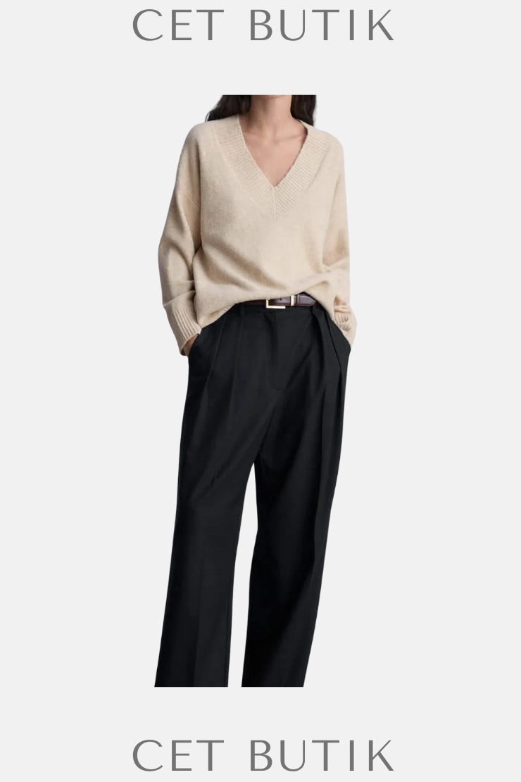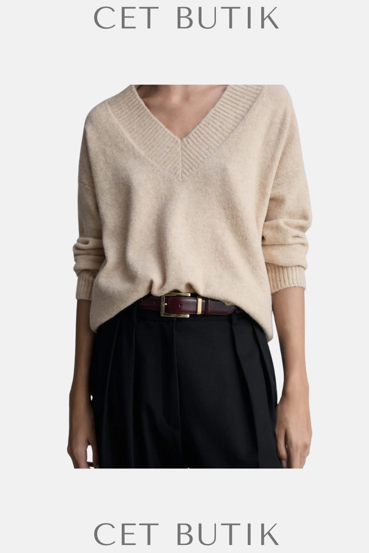 Bej tonuyla kolay uyum sağlar. Oversize kesimi sayesinde salaş duruş sağlar, V yaka detayı ile zarafet katar.