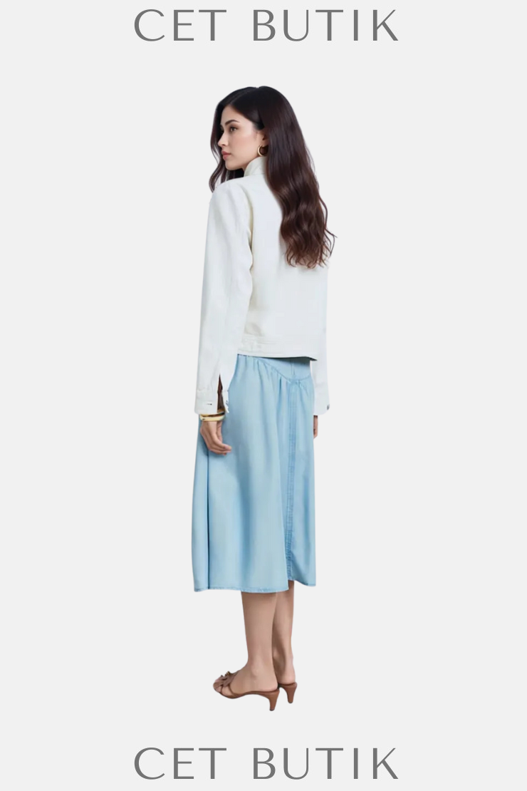 Bu zarif midi etek, yumuşak denim kumaşı ile hem şık hem rahat bir kullanım sunar. Bel kısmında yer alan büzgülü detay, eteğe hacim ve estetik bir dokunuş katar. Midi boyu klasik ve feminen silüet yaratır. Ön kapama düğme + fermuar sistemi ile kolay kullanım sağlar. Beş cep yapısı, denim jean detaylarını eteğe taşır. Farklı üstlerle kombinlenebilir; hem gündüz hem özel davetlerde kullanabileceğiniz bir parça.