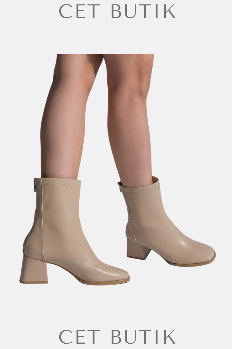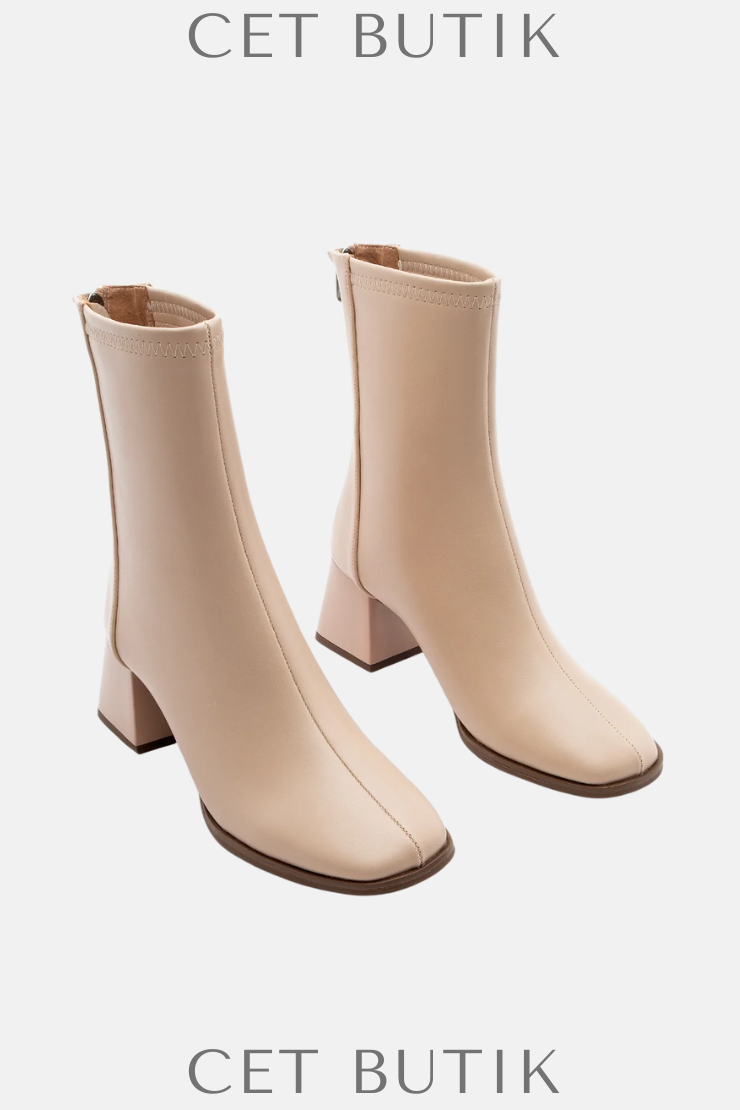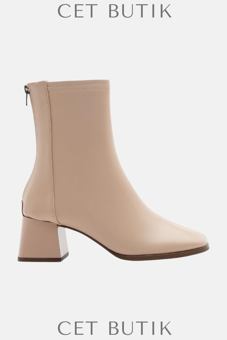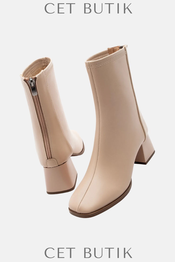 Marjin Nayis Bej Kadın Topuklu Bot – Küt Burun, Arkadan Fermuarlı