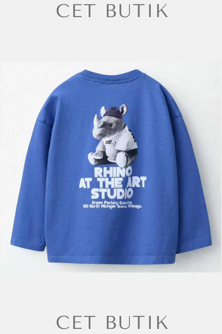 Göz alıcı mavi rengi ve arka kısmındaki eğlenceli “Rhino At The Art Studio” baskısıyla dikkat çeken bu uzun kollu tişört, günlük stiline farklı bir hava katıyor.