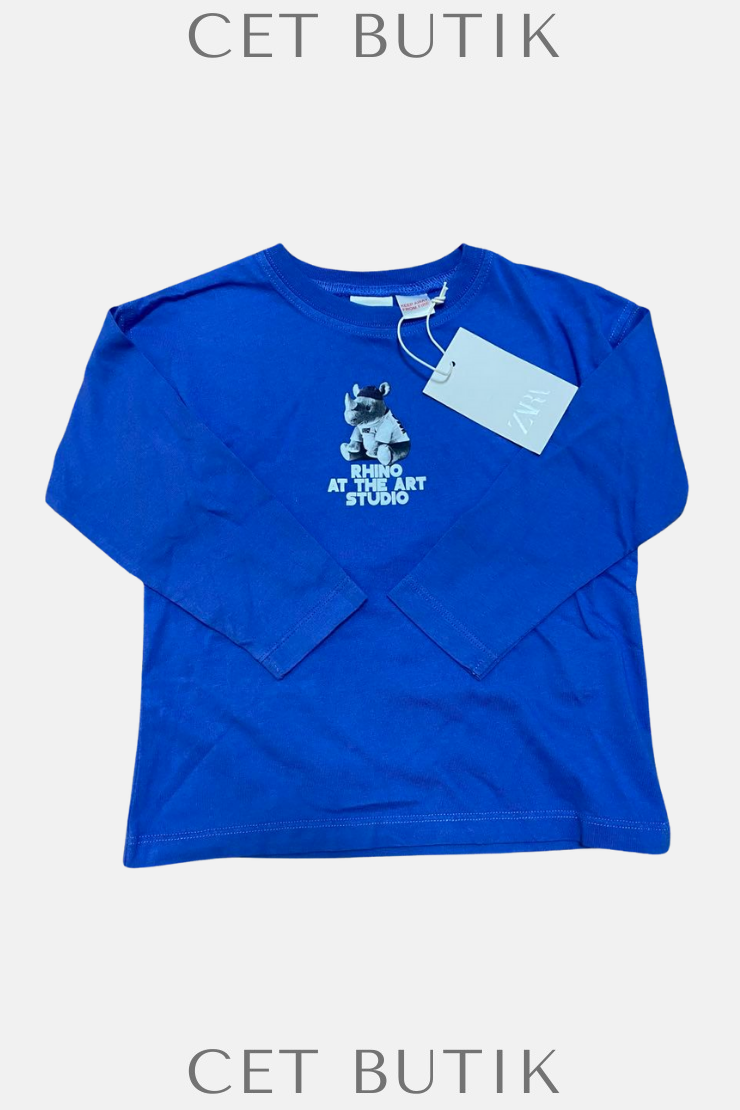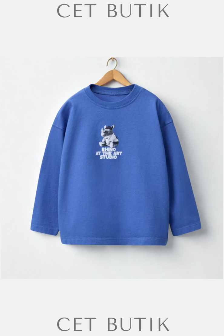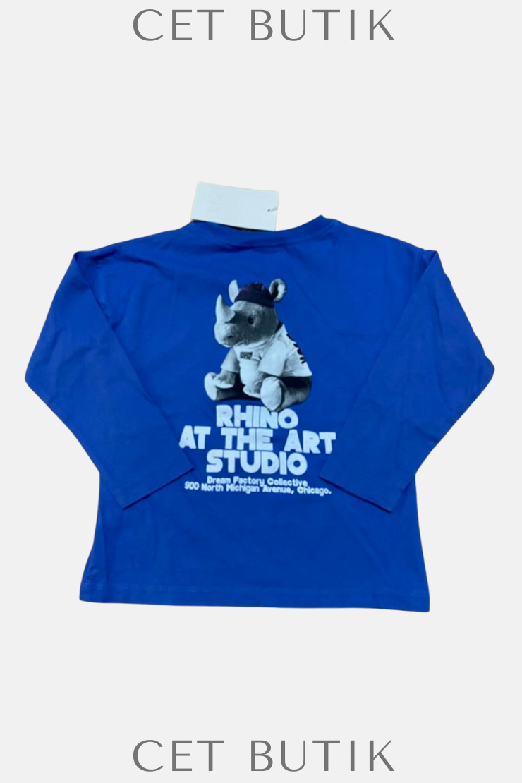 Mavi Uzun Kollu Baskılı Tişört – Rhino At The Art Studio