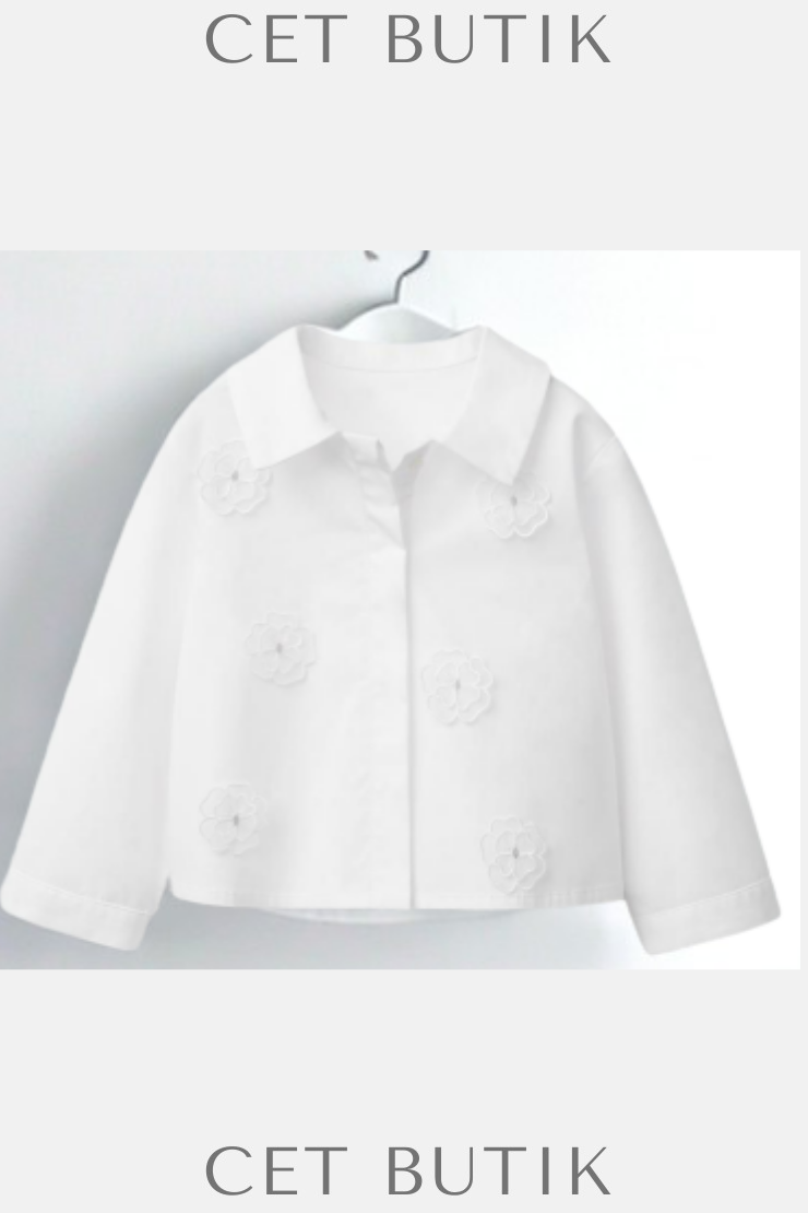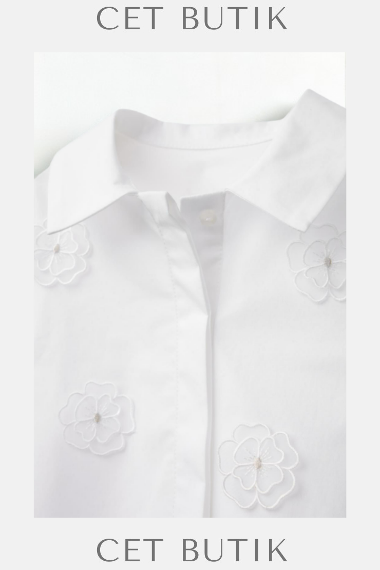 Çiçek aplikeli detaylarıyla dikkat çeken bu gömlek / üst, feminen ve romantik bir stil sunar.