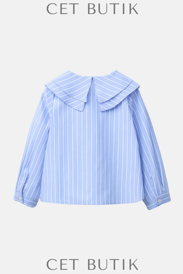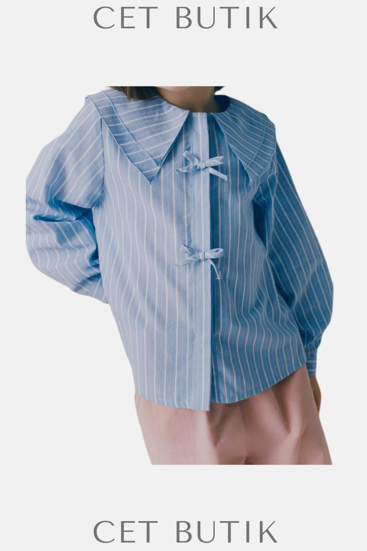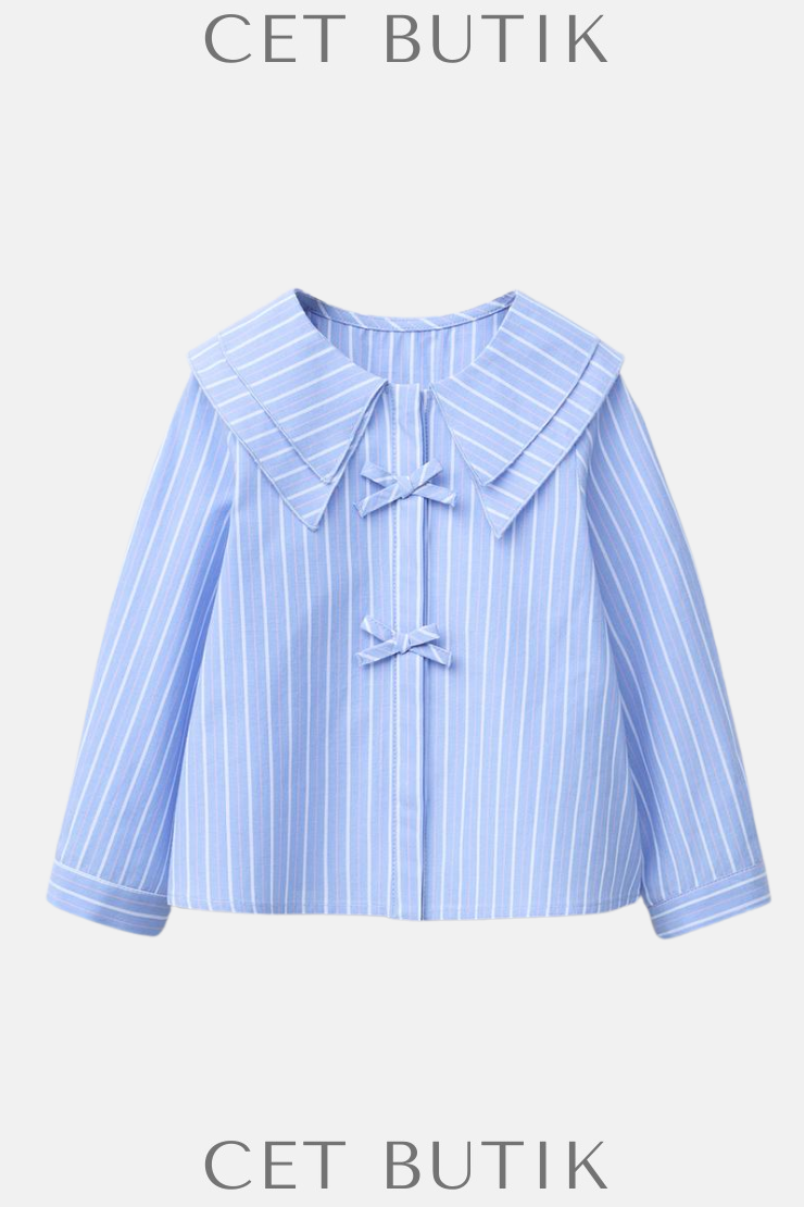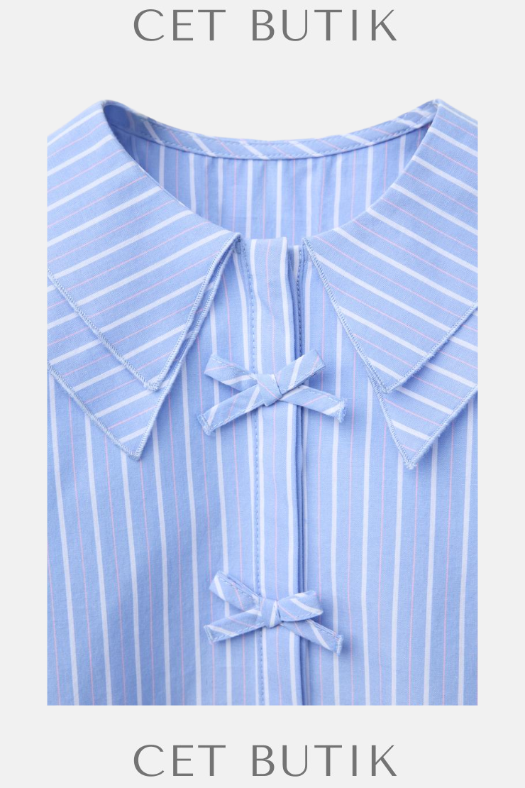 Zara Çizgili Fiyonk Detaylı Pamuk Gömlek – Açık Mavi