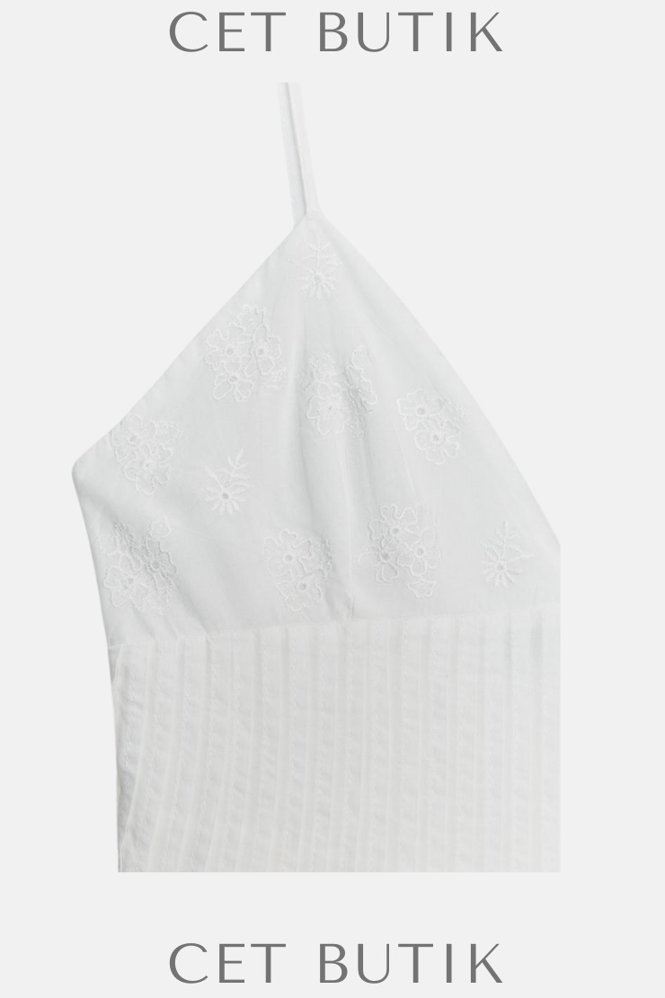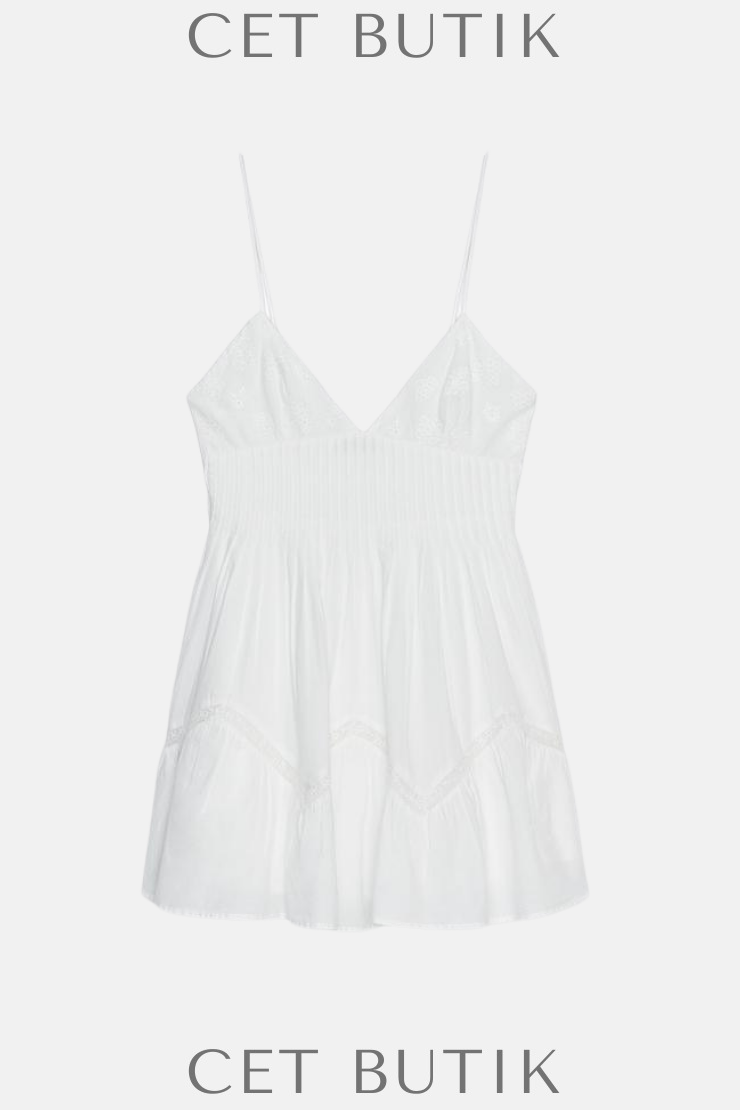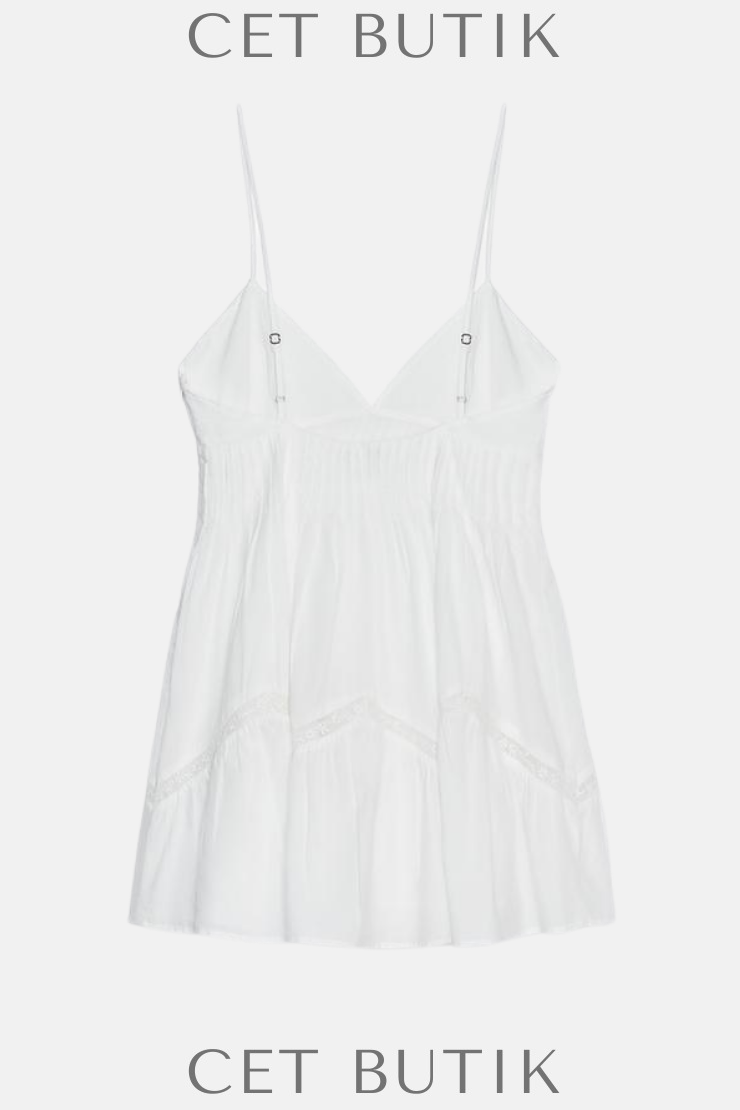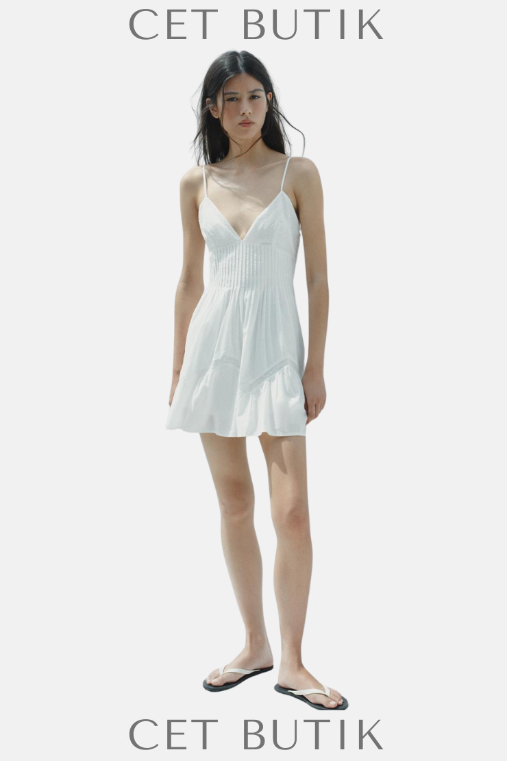Zara’nın %100 pamuk işlemeli kısa elbisesi, V-yaka ve ayarlanabilir ince askılarıyla yazlık şıklığı yakalıyor. Pile ve dantel işlemeler ile zarif detaylar sunarken kombine iç astarı ve yan gizli fermuarıyla rahat kullanım sağlar. Beyaz ve siyah renk seçenekleriyle sunulur, hem gündüz hem gece kombinleri için ideal. Rahatlık ve şıklık arayanların gardırobuna yakışacak klasik bir parça