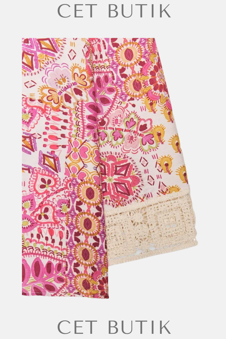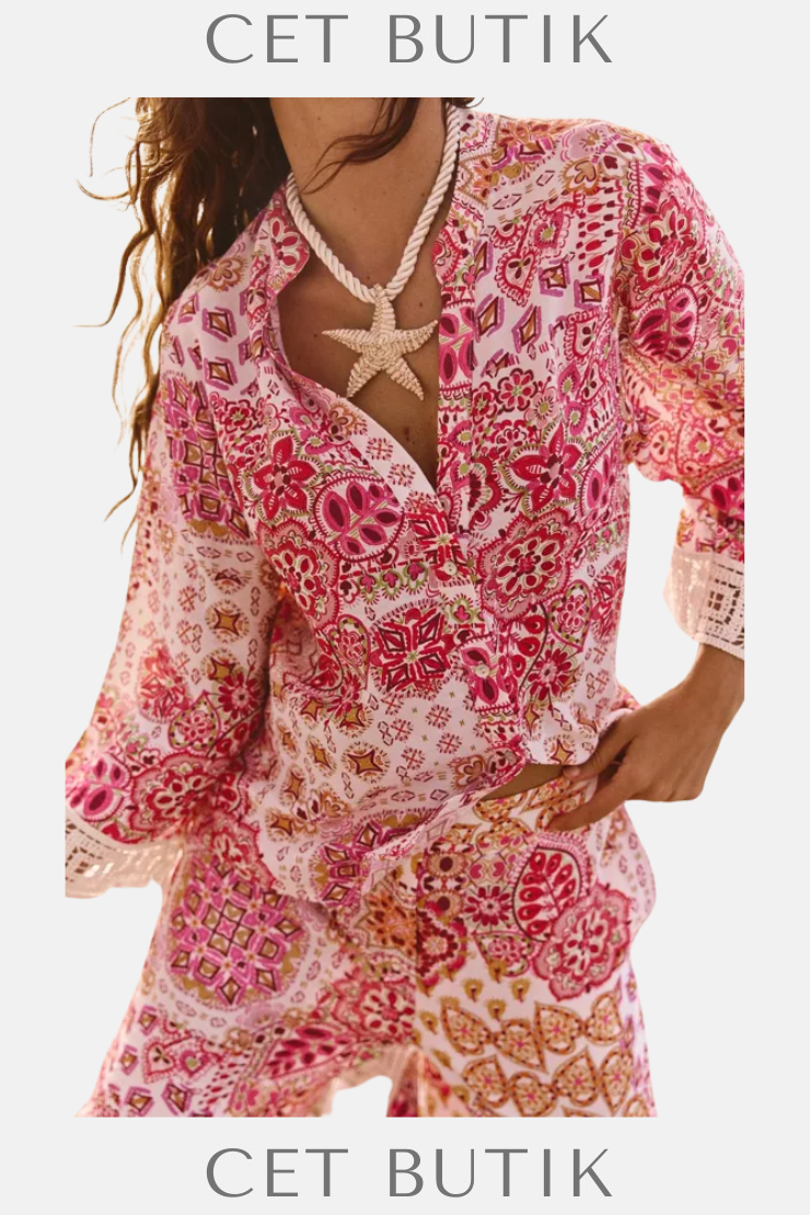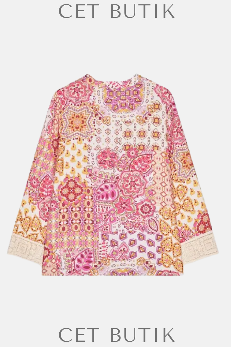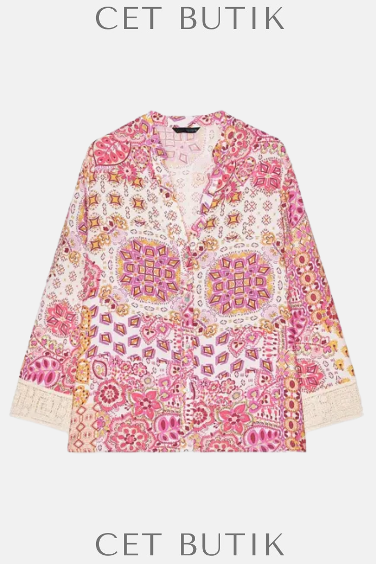 Zarif detaylarla bezenmiş bu Zara 3564/067/330 numaralı bluz, %84 viskon ve %16 poliamid karışımı hafif kumaşıyla yaz akşamları için ideal. Çok renkli baskısı ve guipure dantel işlemeli kolları ile sade kombinleri bile hareketlendirir. V-yaka kesimi ve dirsek altı uzun kollu modeli, hem şık hem de rahat kullanım sunar. Günlük kullanımda tesettür kombinleriyle ya da özel davetlerde tek başına kullanılabilir.