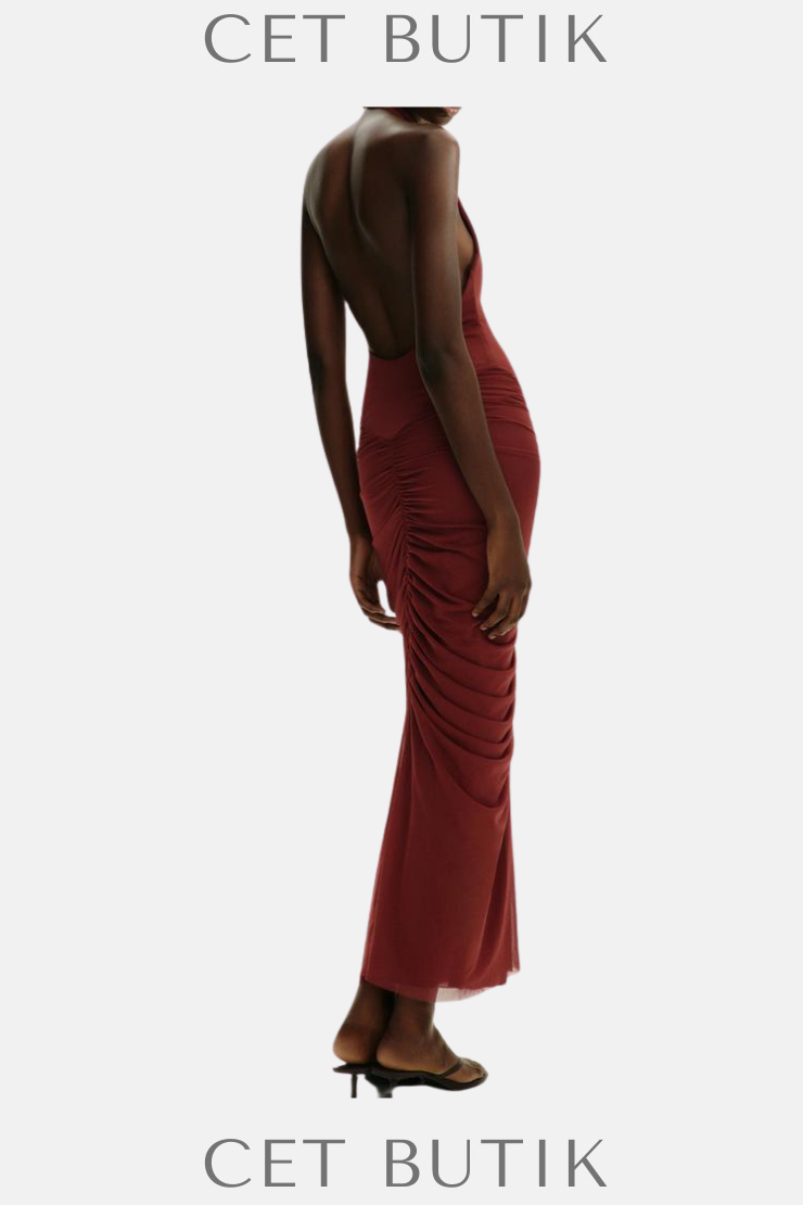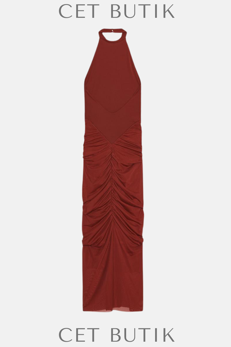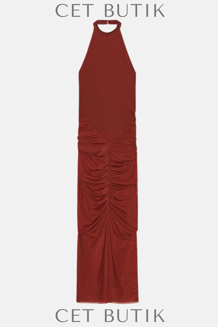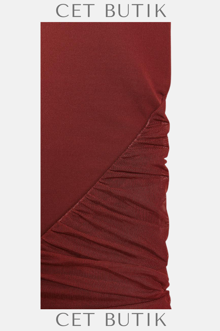 Zara Kadın Halter Yaka Tül Kombinasyon Elbise – Koyu Kırmızı