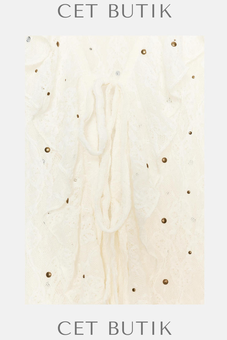 Zara’nın “Studded Lace Top” modeli, zarif ve feminen detaylarıyla göz dolduruyor. Ecru tonundaki yarı transparan danteli, V-yaka kesimi ve uzun kollarıyla hem özel günlerde hem de stilinize romantik dokunuş eklemek istediğiniz anlarda ideal. Omuz ve manşetlerdeki fırfır ve perçin detaylarıyla sade olduğu kadar karakterli bir görünüm sağlar. %98 polyamide + %2 elastane karışımı kumaşıyla hem görsel şıklık hem de esneklik sunar. Fırfır ve dantel dokusuyla kombinlenebilen bu parça, jean ya da şifon eteklerle birleştiğinde zarafeti tamamlar.