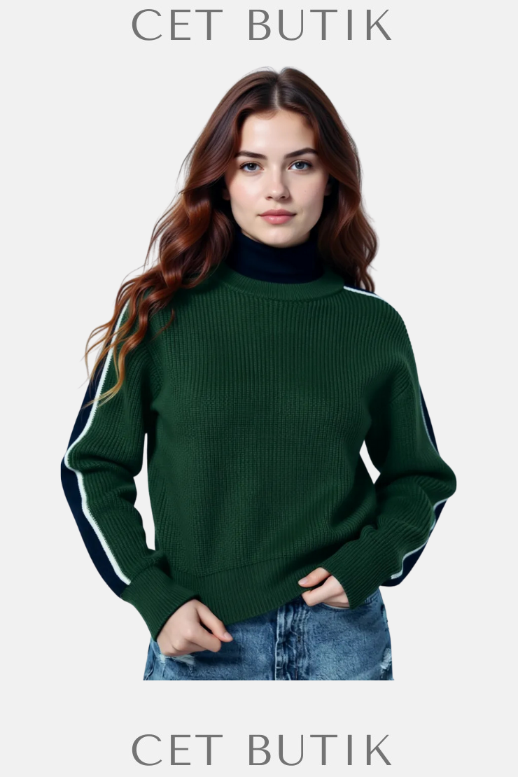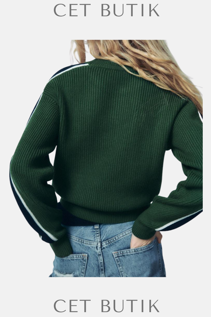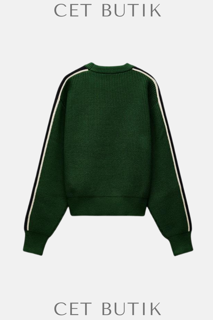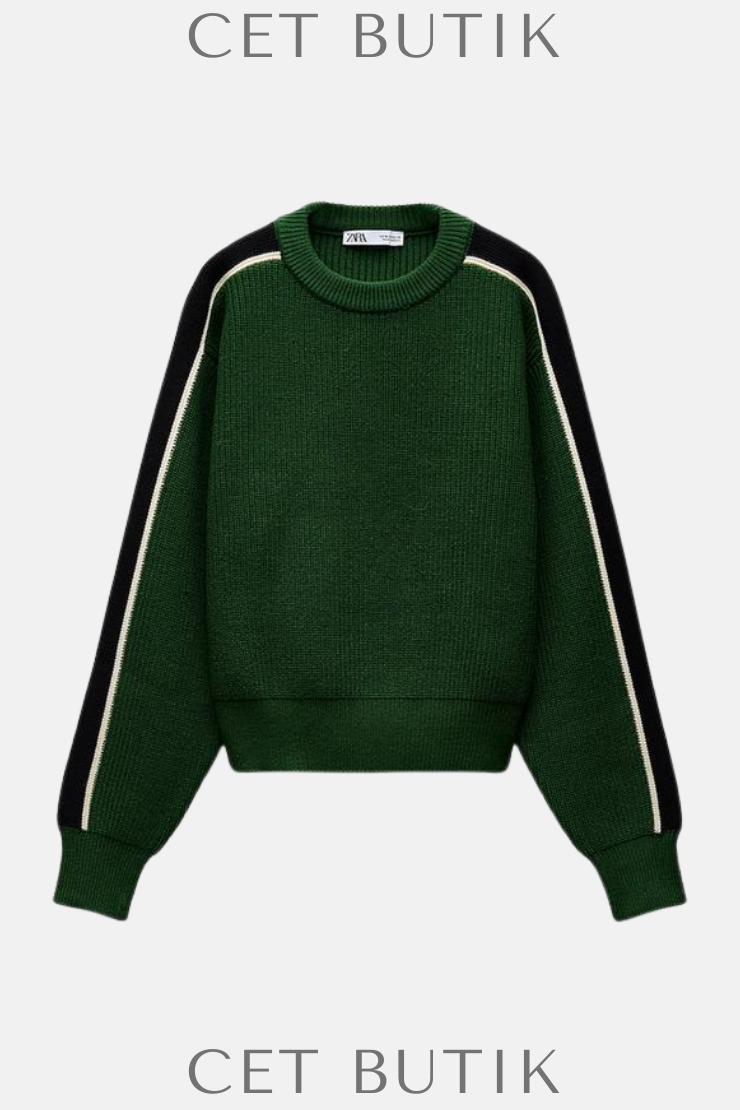 Zara Yan Şerit Detaylı Yeşil Triko Kazak
